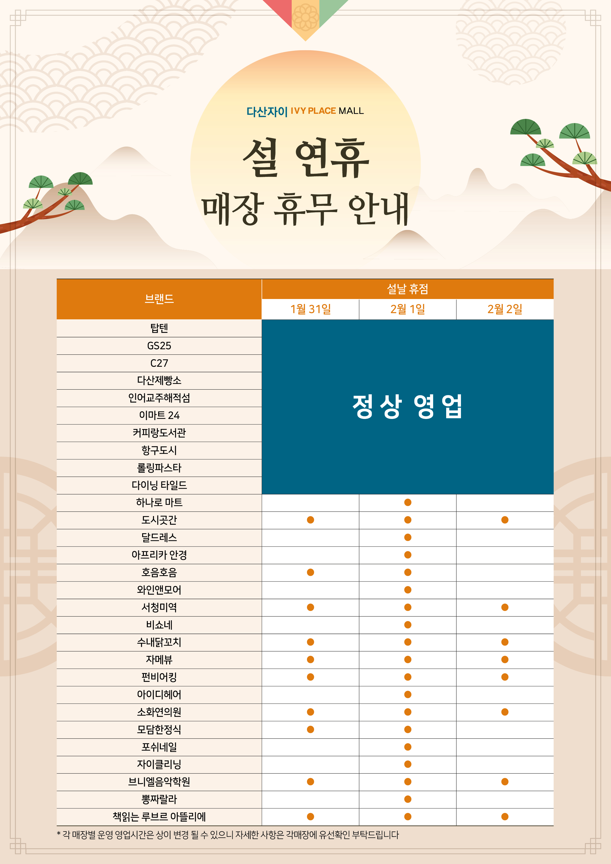 설날 휴무매장 안내(1/31~2/2)